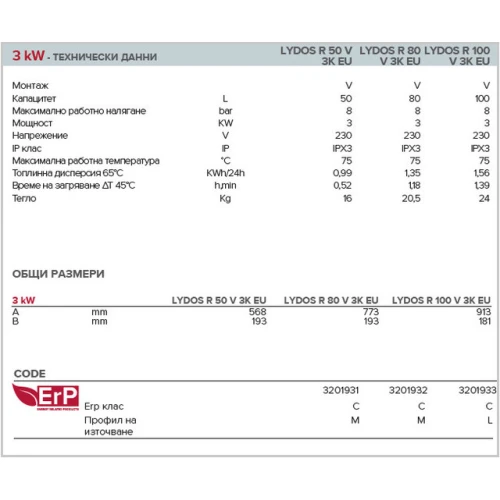 Бойлерът Ariston Lydos R 3К EU с технологията WaterPlus се постига 16% повече топла вода, а двойният предпазен термостат се грижи за безопасното му ползване. Вътрешният резервоар е с титаниев емайл, а големият магнезиев анод се справя с корозията. Бойлерът Ariston Lydos R 50 V EU e в съответствие с най-строгите разпоредби за ESWH.