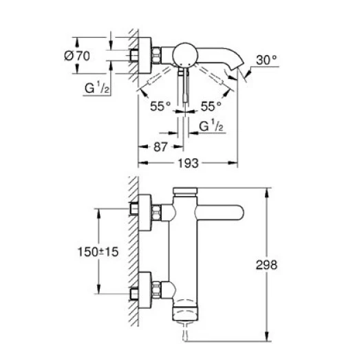 GROHE Eurosmart, едноръкохватков смесител за вана/душ, за стена, хром, с чучур