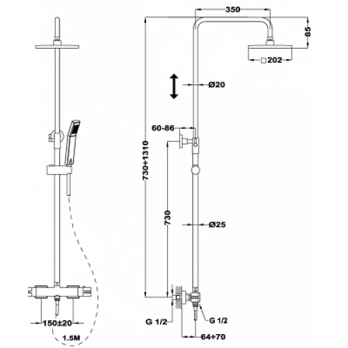 | Регулиране височината на стационарният душ | мин: 73 см. – макс: 131 см. |