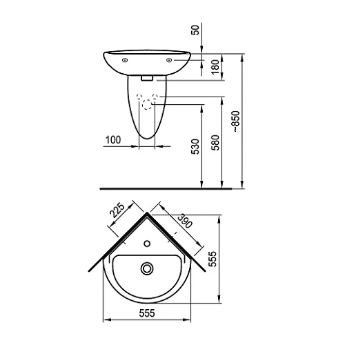 Мивка за баня NEO 555 на търговска марка Fayans се с елегантен дизайн и високо качество, предназначен за ъглов монтаж. Материалът, от който е направен е санитарен порцелан, с висока устойчивост срещу въздействието на киселини и други активни химични препарати.