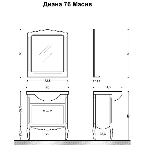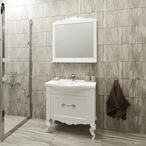 Комплект мебели за баня Диана 76 са изработени от масивна дървесина с влагоустойчиво бяло гланцово покритие.