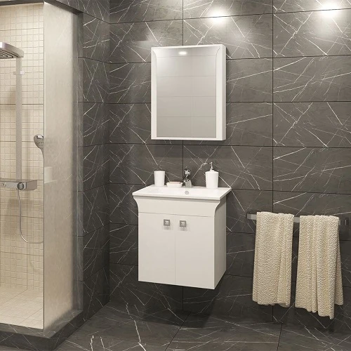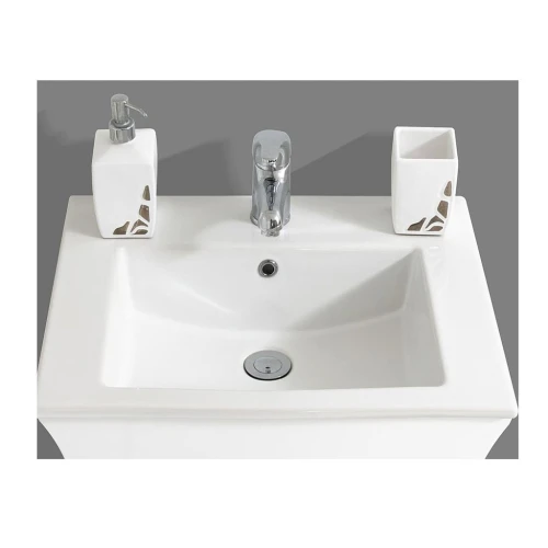 Комплект мебели за баня Линеа 55 см, с бяло гланцово покритие, изработени от водоустойчиво PVC с дебелина 18 мм.