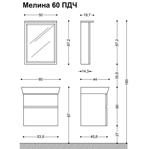 Комплект мебели за баня Мелина 60 са предназначени за сухи и проветриви помещения. Изработени са от ПДЧ с дебелина 18 мм