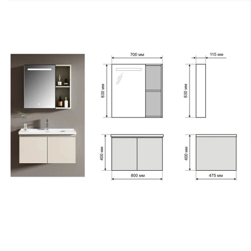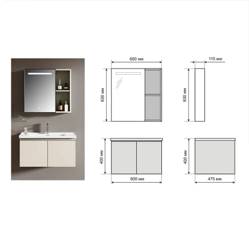 Мебели за баня UMAG, комплект, от PVC, 60 и 80 см. - долен шкаф с умивалник и горен шкаф с LED огледало