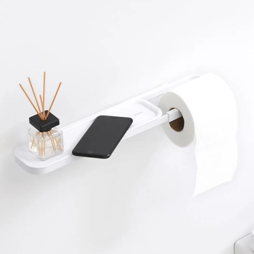С този дизайн освен, че имате лесен начин за окачване на тоалетна хартия, получавате и допълнително малко рафтче за вашия телефон или други принадлежности.