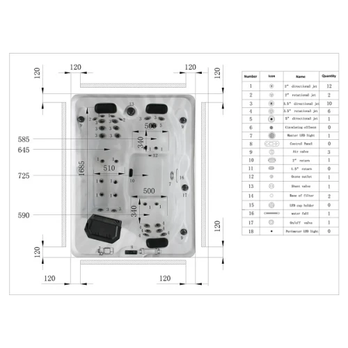 | Хидромасаж | 31 бр. дюзи за масаж, 1 бр. помпа, регулатор на въздух, филтри |