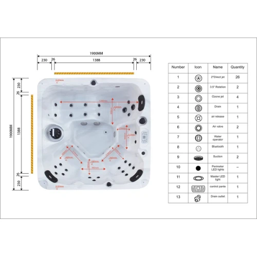 | Хидромасаж | 32 бр. дюзи за масаж, 2 бр. помпи, регулатор на въздух, филтри |