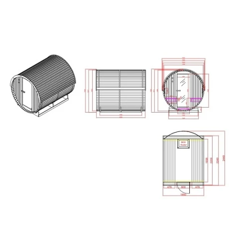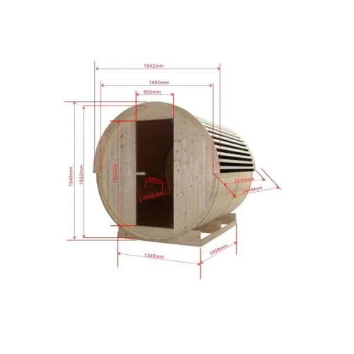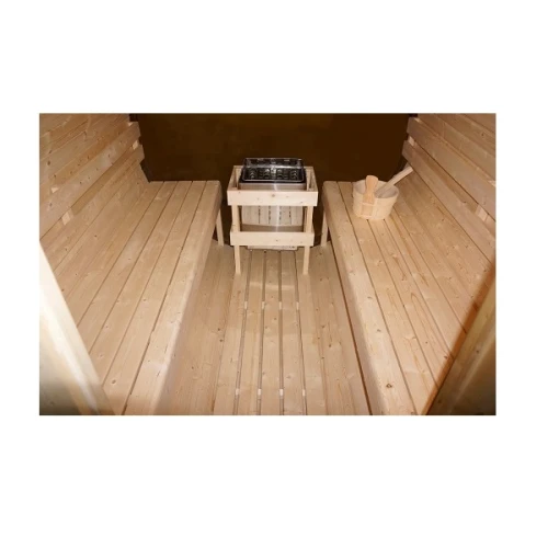 - Аксесоари: Нагревател за сауна, включително камъни за сауна, кофа, черпак, термометър, пясъчен часовник